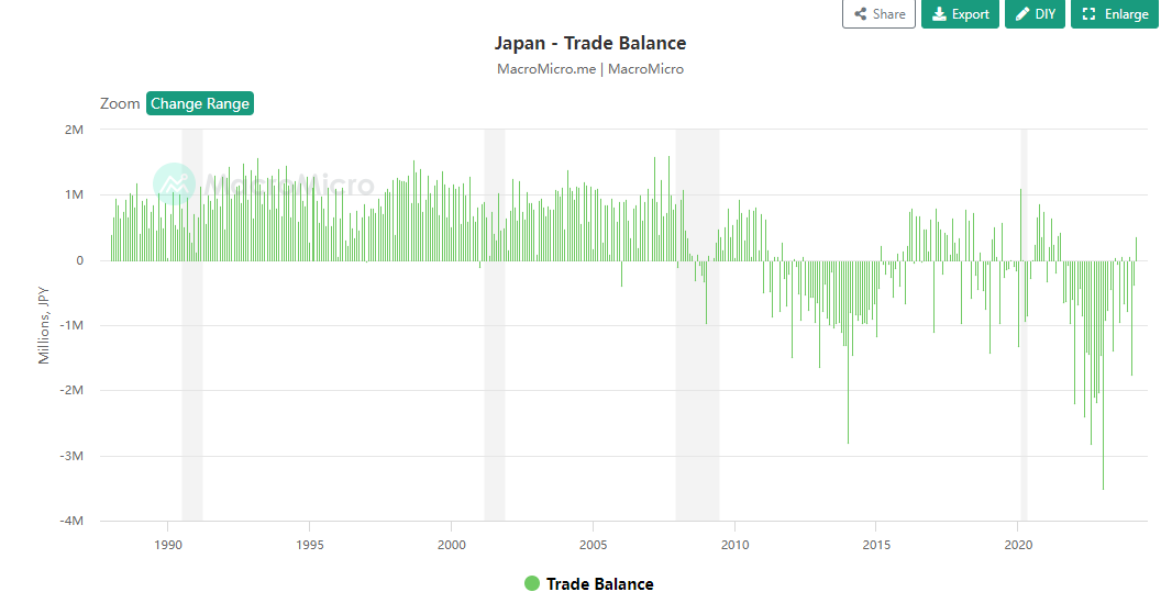 米国と日本の金利差が広がり、資本流出が促進されています。日本は貿易赤字と内需の低迷に直面しています。さらに、日本の深刻な負債問題も円安に寄与しています。