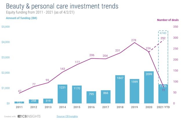 新型コロナウイルスの世界的な感染拡大にもかかわらず、2020年の美容・パーソナルケア分野のスタートアップによる資金調達額は20億ドルを超えて過去最高に達しました。2021年もこの勢いは続いており、4月2日までの投資額は11億ドルに達しています。