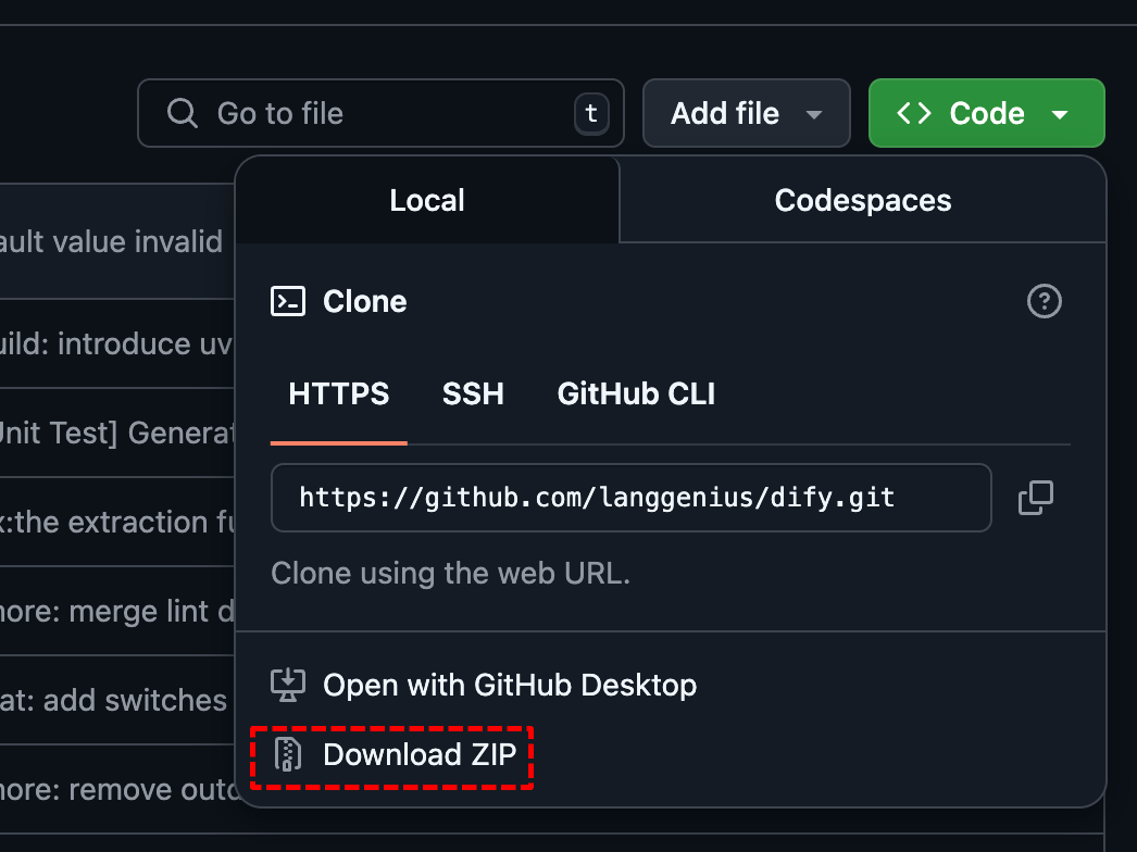 - ZIP でダウンロードした場合は展開して dify フォルダへ移動(GitHub ボタンの「Download ZIP」を利用可)。